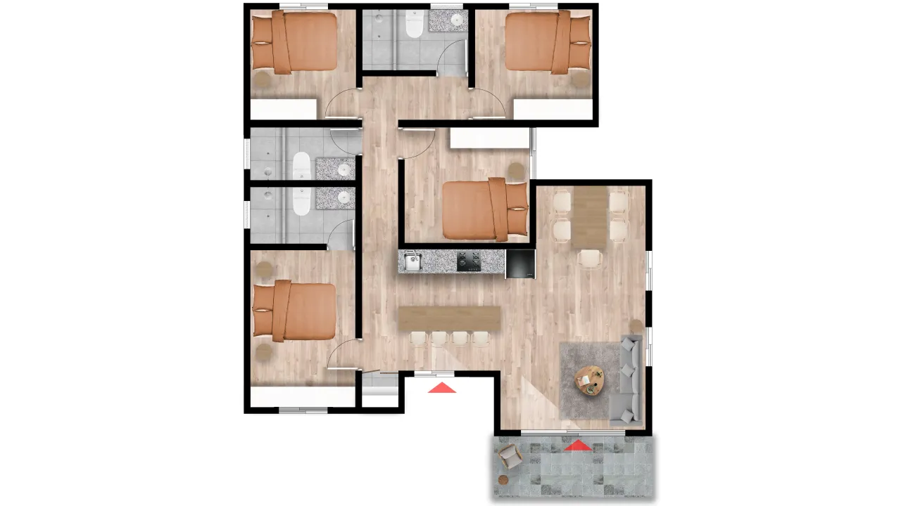• 4 Dormitorios: Dormitorios cómodos y versátiles, pensados para el bienestar de cada miembro de la familia o para recibir cómodamente a los invitados.